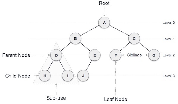 Tree structure မှာလည်း သူ့ရဲ့ အခေါ်အဝေါ်လေးတွေရှိတယ်။ Root - tree တစ်ခုလုံးရဲ့ ထိပ်ဆုံးက Node. Parent - parent node ဆိုတာကတော့ သိတဲ့အတိုင်း sub tree (child node) တွေရှိ(ပိုင်ဆိုင်)တဲ့ node. Child - node တစ်ခုရဲ့ အောက်မှာ sub tree အနေနဲ့ ရှိနေတဲ့ node. Subtree – node တစ်ခုရဲ့ အောက်မှာရှိတဲ့ sub tree structure တစ်ခု(parent ရှိတယ်၊ child ရှိတယ်။). Leaf - child node တွေမရှိတဲ့ node. Tree structure မှာလည်း အဆင့်ဆင့် သတ်မှတ်ထားတဲ့ level တွေလည်း ရှိတယ်၊ ဥပမာ root node က level 1, root node ရဲ့ အောက်က level 2. Tree structure မှာ search လုပ်တဲ့ အခါတို့ တစ်ခြား operation တွေလုပ်တဲ့ အခါမှာ node တွေတစ်ခုခြင်းဆီ ကို လိုက်ထောက်တာကို လည်း traversing လုပ်တယ်လို့ခေါ်ပါတယ်။