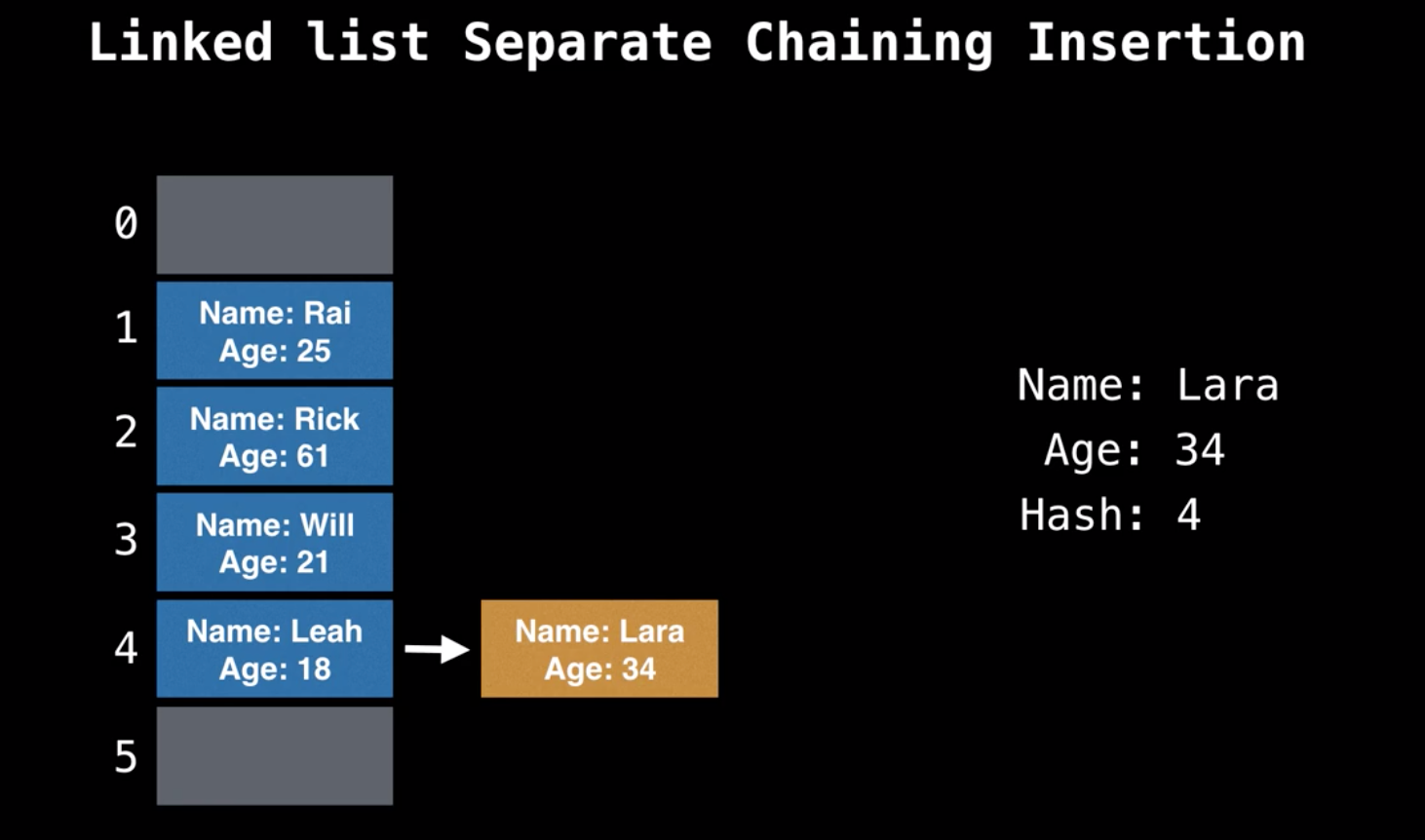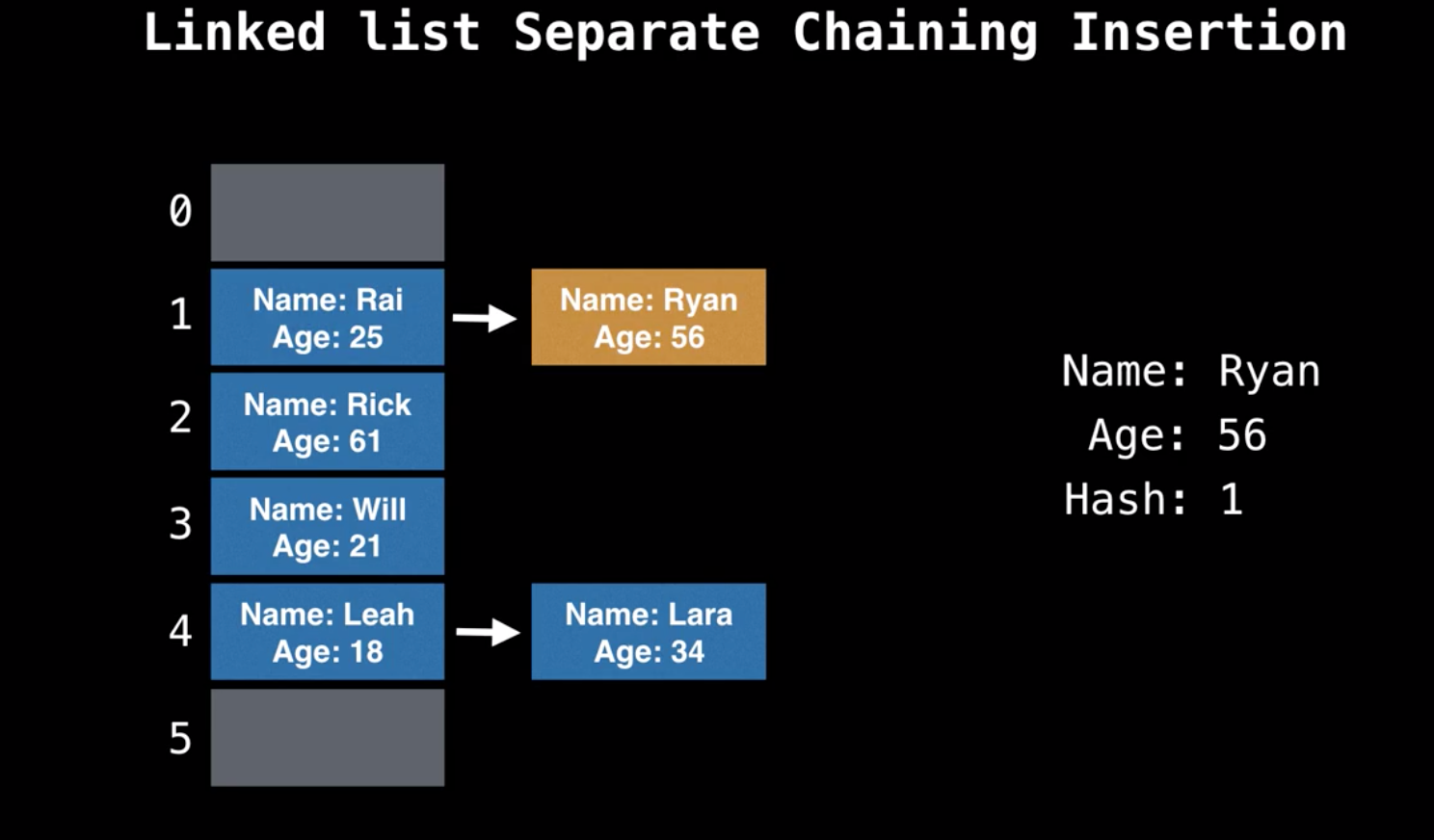 စကားဦးတွေလည်းများပြီမို့ separate chaining စလိုက်ရအောင်၊ hash table မှာဖြစ်လေ့ရှိတဲ့ collision issue ကိုဖြေရှင်းနိုင်မယ့် strategy တွေထဲကတစ်ခုပဲ ၊ သူ့ရဲ့ ထူးခြားချက်က ဝင်လာသမျှ data node အားလုံးကို တစ်ခုမှဖျက်မပစ်ဘဲနဲ့ collision လည်းမဖြစ်အောင် hash table ရဲ့ data structure လည်းမပျက်အောင် ဖန်တီးပေးထားနိုင်တယ်၊ linked list algorithm ကို အခြေခံပြီး ဖြေရှင်းပေးထားပါတယ်။